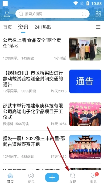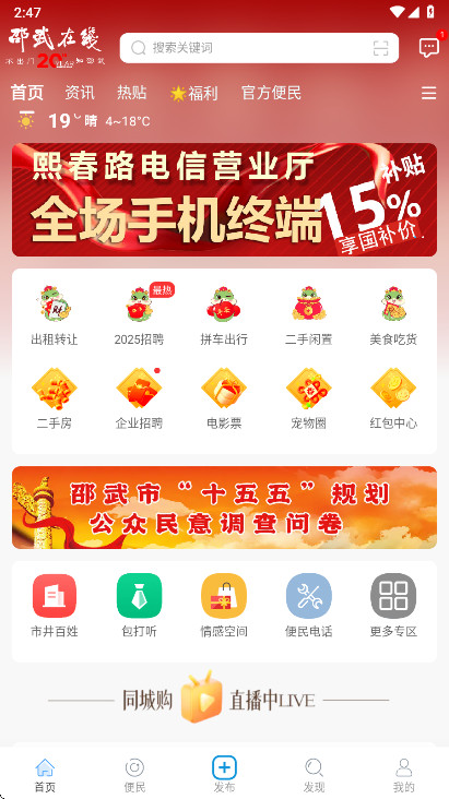 1、进入到软件的首页中可以看都有许多的功能和当地的各类资讯新闻