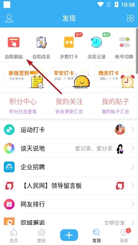 2、在发现页面找到【自助删帖】功能