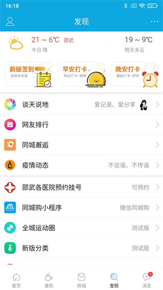 2、在发现板块中,有各种社交类的服务,如谈天说地、网友排行、同城邂逅等