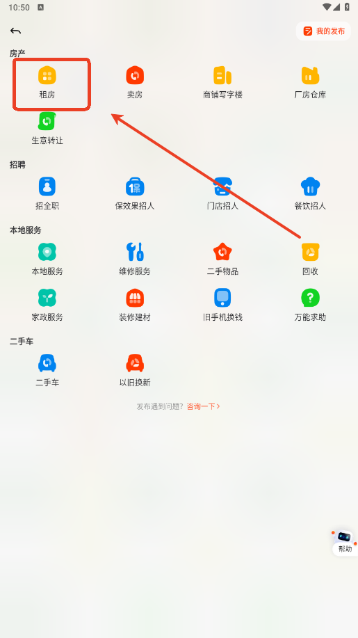 2.例如你想发布租房信息。点击左上角“租房”按钮。