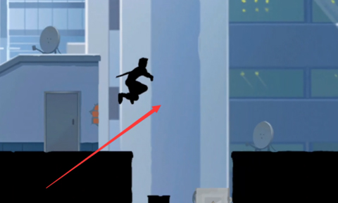 5、首先注意,主角现在这个位置的后面是一段加速的路,路的尽头是一个墩,也就是图中最左边那一点点高的东西(截图不完整),在这段路加速后差不多到墩的时候要向左划一下屏幕减速,然后跳刀墩上再起跳(图中的动作),去到前面那个人那段路,大概到那块公告牌的位置,向下划一下屏幕去到这关的第二个隐藏场景。