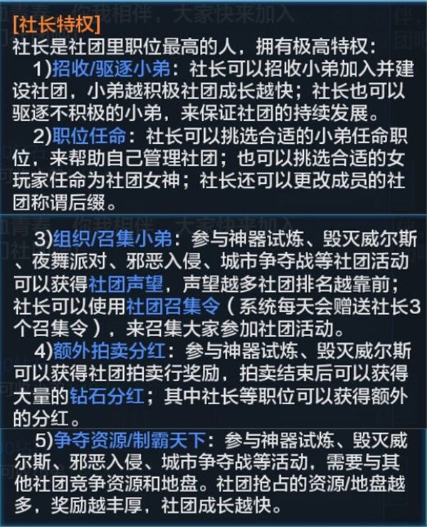 创建社团需要输入社团名称(社团名称会显示在角色头顶哦,记得起一个好听霸气的名字呢)和社团宗旨并且消耗1000钻石,当然花了这么多钻石创建了社团身为社长也是有特权可以享受的。