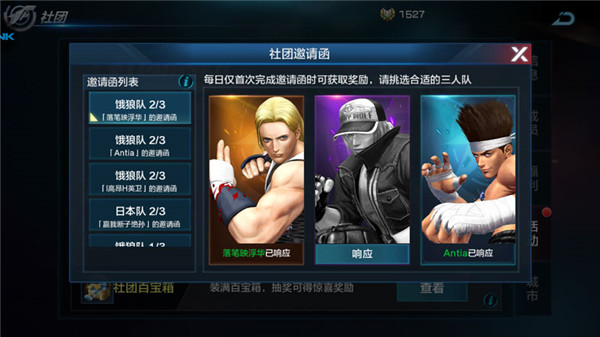 3、社团邀请函:向社团内的成员发起KOF三人组的邀请,当三人全部响应时邀请函完成,发起者和响应者可获得经验奖励,玩家每天可以发起一次邀请获得一次奖励,响应其他成员邀请的次数并没有限制。