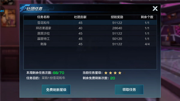 5、社团任务:每周可以完成70次社团任务,完成社团任务可以获得大量经验和社团贡献,任务星级越高,奖励越丰富,每周有20次免费刷新任务星级的机会,格斗家们记得刷新到高星再接任务哦。