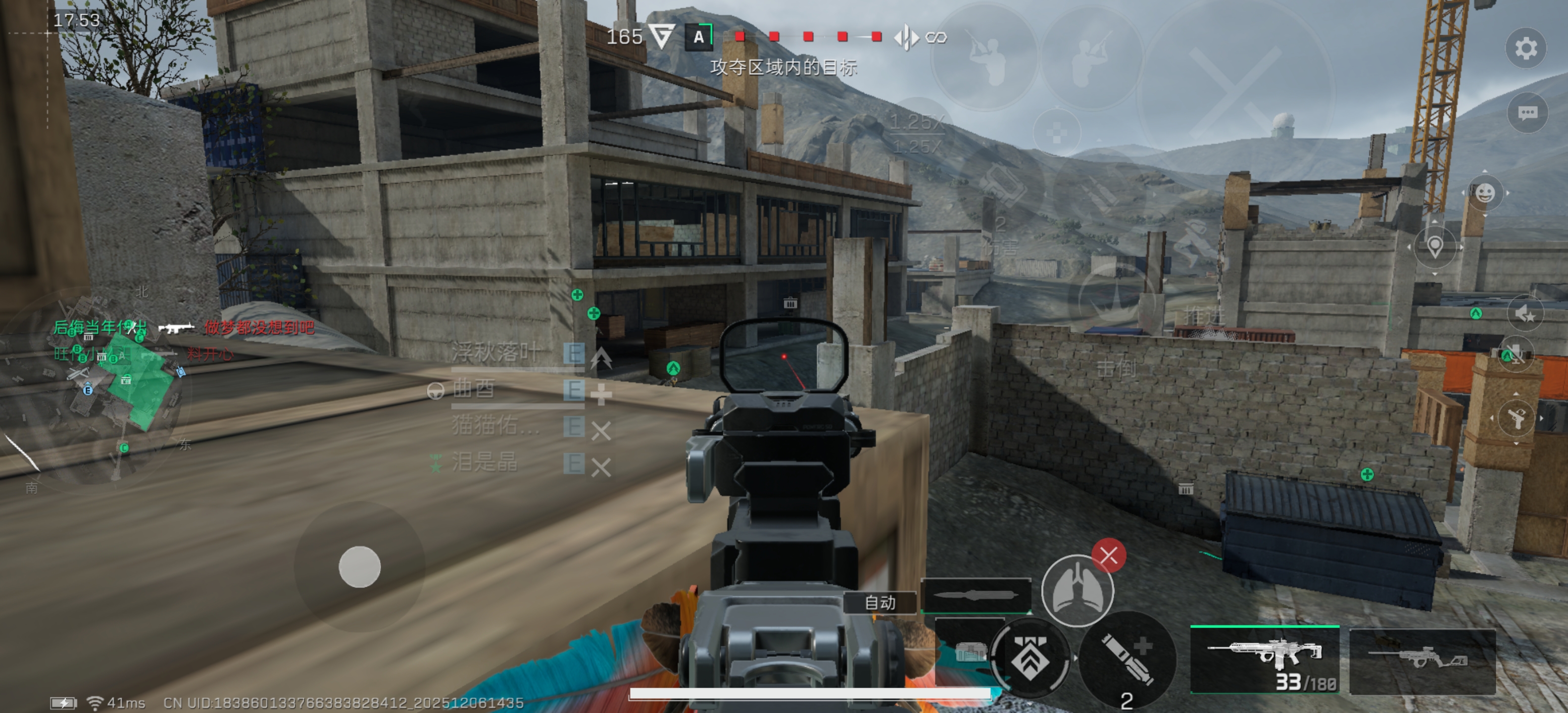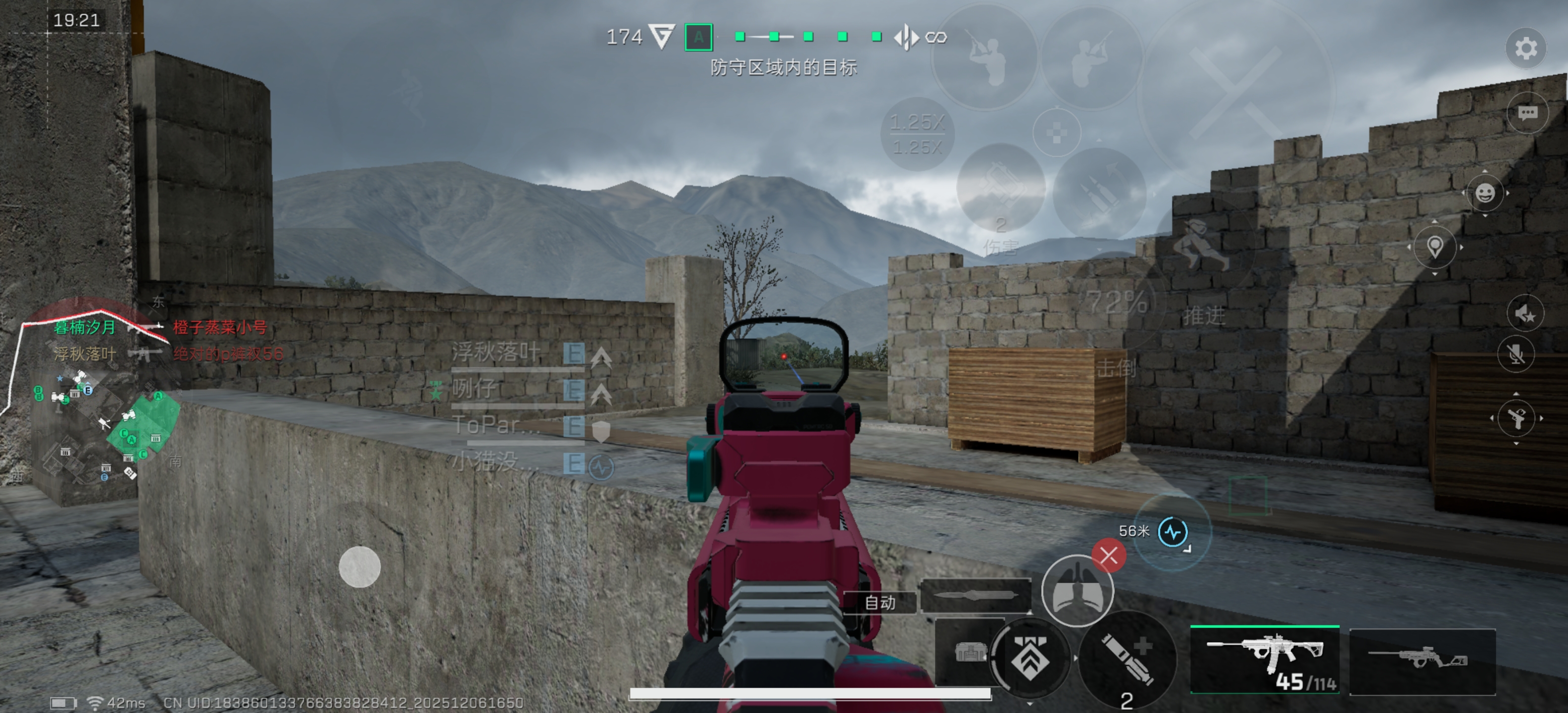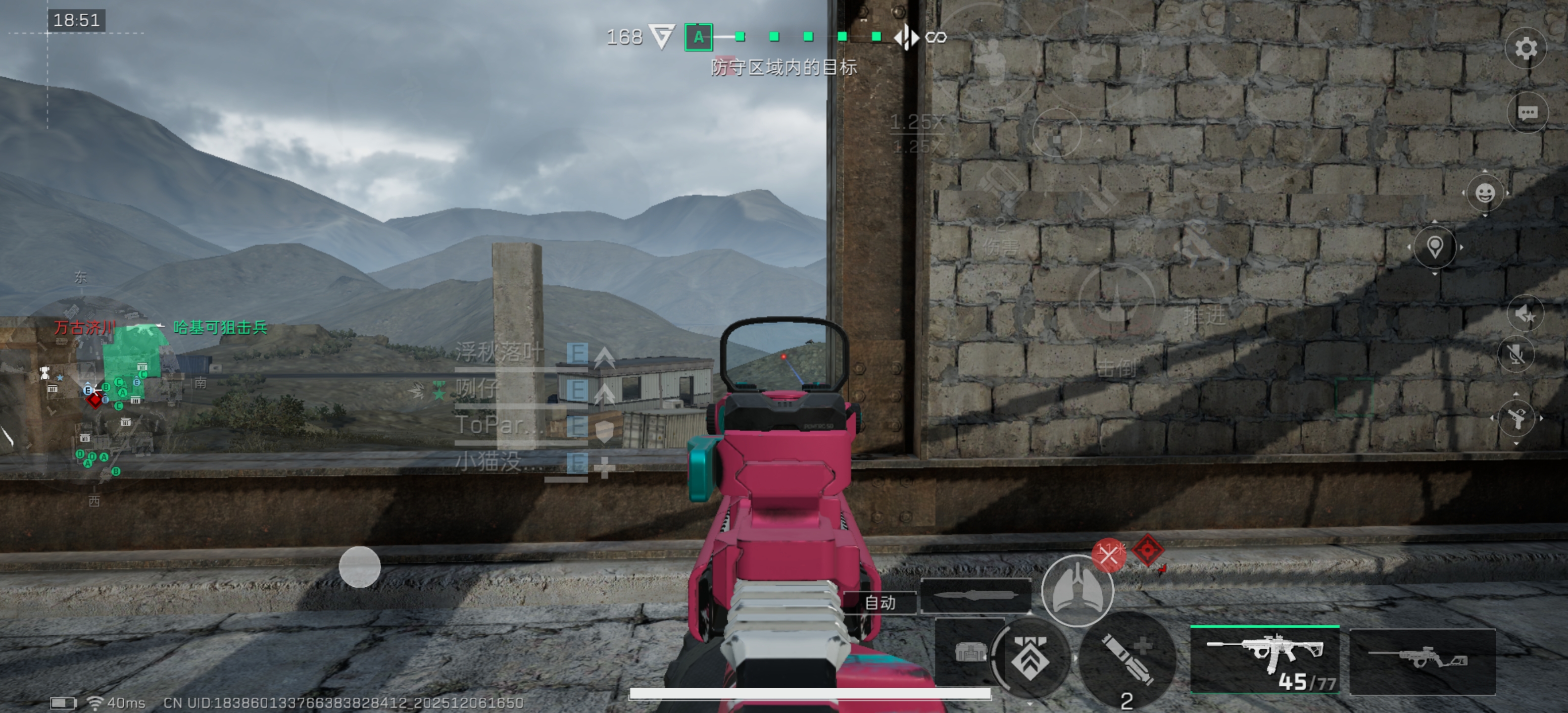 这个点是三层水泥楼的左侧的砖房。这个点不管是防守方还是进攻方,都是绕后、抽人以及补位补火力的绝佳点位可以说是必抢的枪位。所以这个枪位进攻这个点位可以不站人,但是守方这里必须站人。