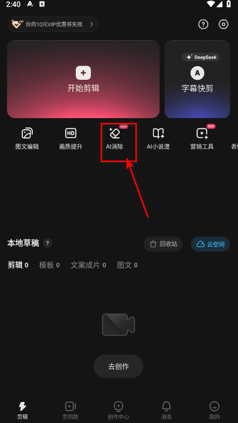 4、通过下方的不同按钮对视频进行剪辑:剪辑、素材、调整、音效、字幕。