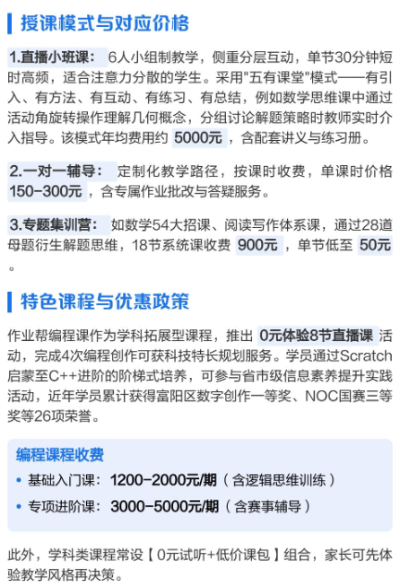 1.直播小班课:6人小组制,年均费用约5000元,含“五有课堂”模式(引入/方法/互动/练习/总结),配套讲义与练习册。