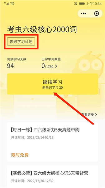 4.进入选择单词类型界面,“修改学习计划”可以修改单词类型,选择“继续学习”选项。
