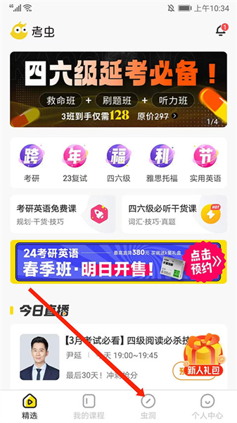 1.用六级真题举例。打开考虫App后,在主界面右侧找到“四级”入口并点击进入。