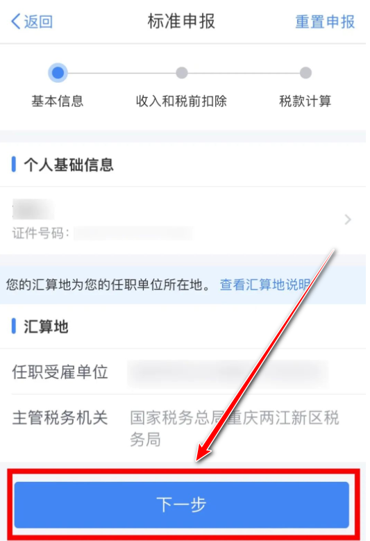3.进入标准申报页面后,核对个人基础信息.汇算地,确认无误后点击【下一步】,如果有两处及以上任职受雇单位的,可自主选择向其中一处申报。