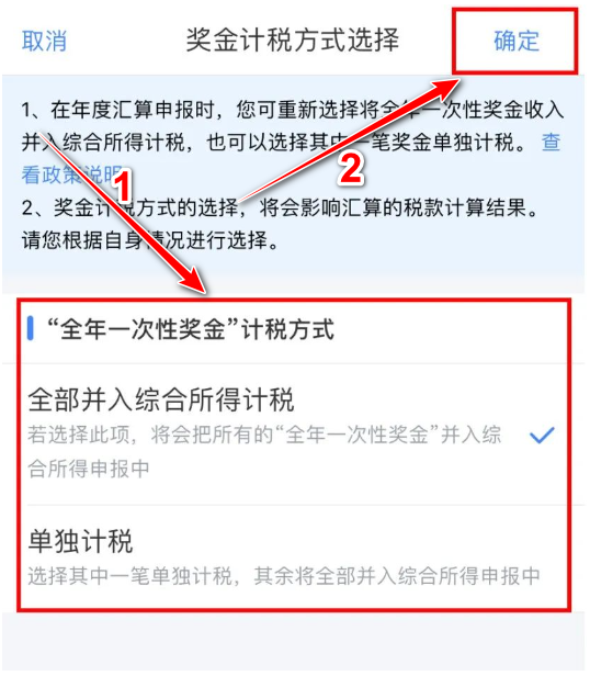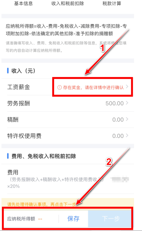 4.接下来选择年终奖计税方式,在“收入和税前扣除”页面,如果系统提示“存在奖金,请在详情中进行确认”,您需要点击“工资薪金”栏右侧提示框,选择年终奖计税方式。您可以分别选择【全部并入综合所得计税】和【单独计税】,查看系统自动计算出的结果,比较一下,哪种划算选哪种,然后点击【下一步】。