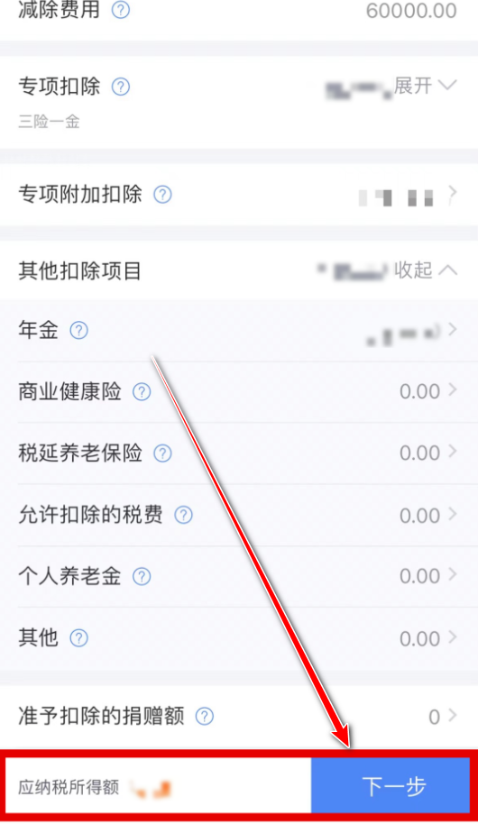 6.请仔细检查核对收入明细.专项附加扣除.其他扣除.个人养老金等信息,如果存在错漏可及时调整,如果核对无误就直接点击【下一步】。