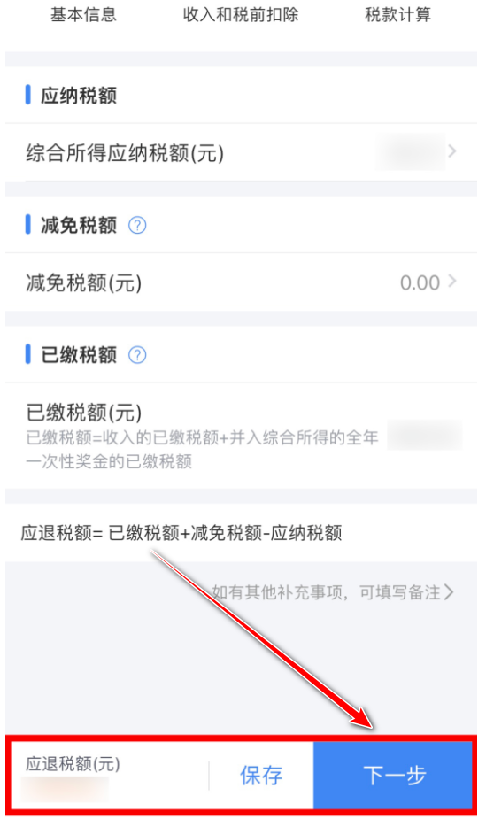 7.接着查看应退(补)税额,系统会自动进行税款计算,在页面左下方显示“应退税额”或“应补税额”,确认无误后点击【下一步】即可。如下图所示。
