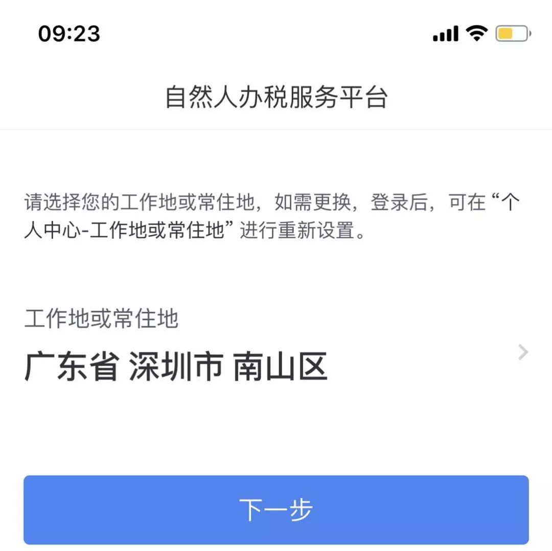 1.下载后,打开APP,工作地或常住地下拉列表选择“广东省XX市XX区(县)”,点击“下一步”。