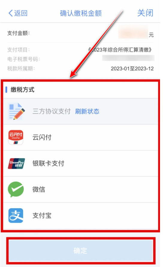 12.通过选择三方协议支付.云闪付.银联卡支付.微信.支付宝等方式,再点击确定,完成缴税即可。