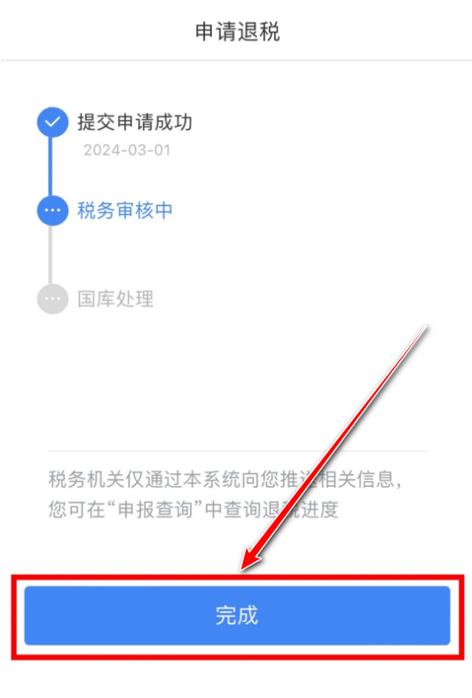 10.点击完成,待审核通过后,退税款将直接退到您的银行账户。因汇算人数多,退税款到账所需时间较长,请耐心等待。