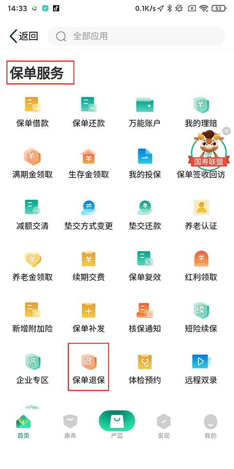 4.在保单服务下找到并打开保单退保,进入依照步骤进行退保即可。