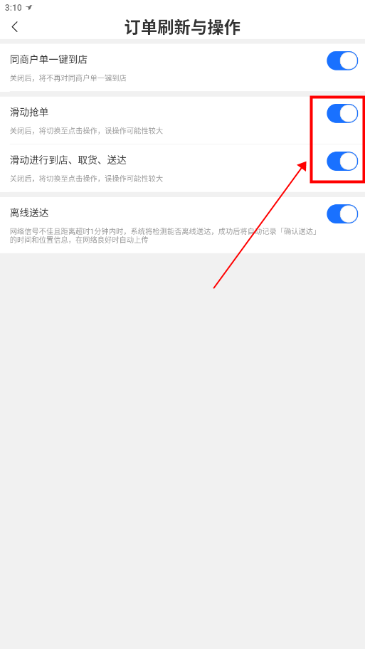 4.可以将“滑动抢单”与“滑动进行到店、取货、送达”两个都打开,可以更快的实现抢单。