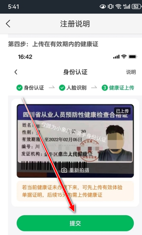 2.根据软件的提示,上传有效期内的健康证,最后点击提交即可。
