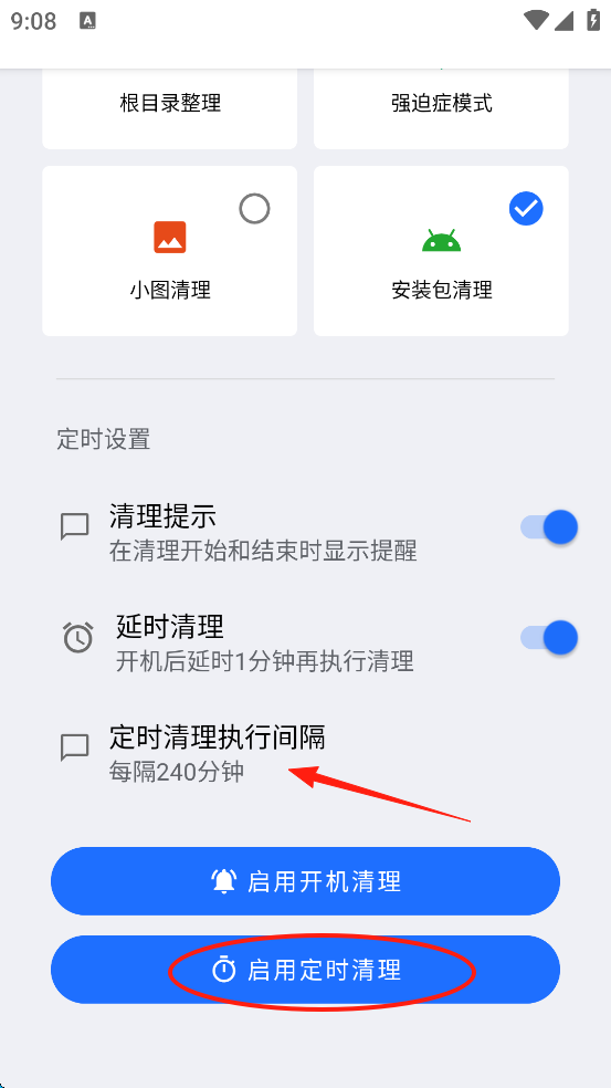 4、可以选择开机自清理,也可以点击“定时清理执行间隔”来自定义间隔时间,最后点击屏幕下方“启用定时清理”。