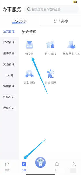 1、打开公安一网通办软件,在办事治安管理界面,点击【保安员】。