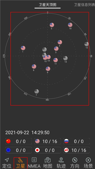 3、点击卫星,可查看卫星数,卫星分布,卫星信号强度等信息。