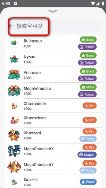 6、在搜索栏输入宝可梦名称或直接从列表中选取目标宝可梦。