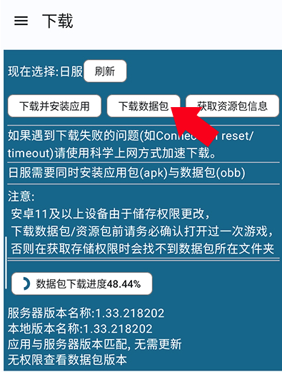 8、再次点击【下载数据包】,开始下载并自动安装OBB文件,等待下载完成即可正常启动游戏。