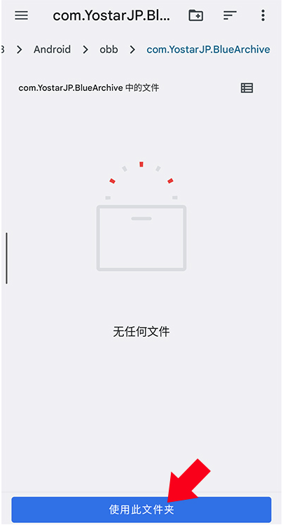 6、系统跳转至文件管理器,自动定位到路径:android/obb/com.YostarJP.Bluearchive,确认该目录存在后,点击下方【使用此文件夹】进行授权。