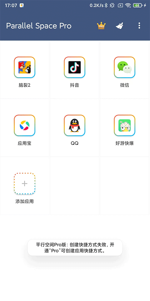 1、打开平行空间APP专业版,点击添加应用至平行空间,登录第二个账号;