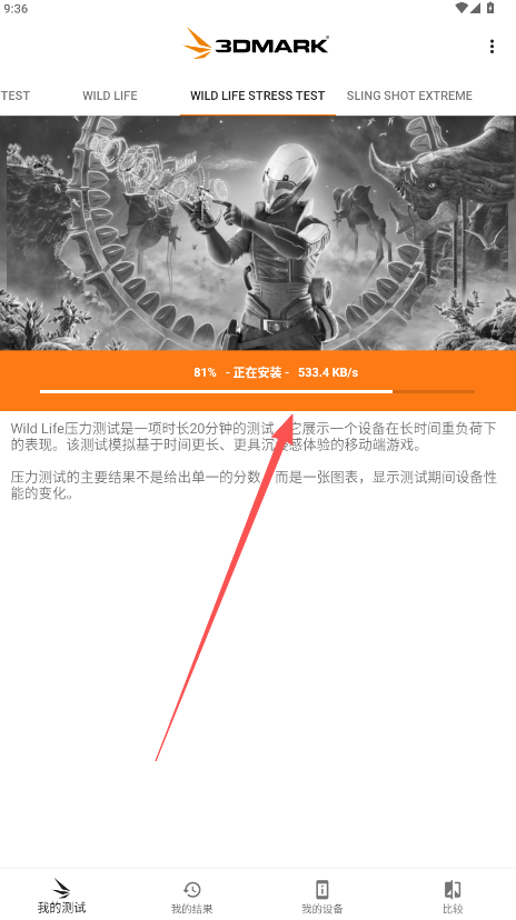 1、3DMark测试显卡手机app端需要先行下载测试数据,点击等待数据安装加载到100%。