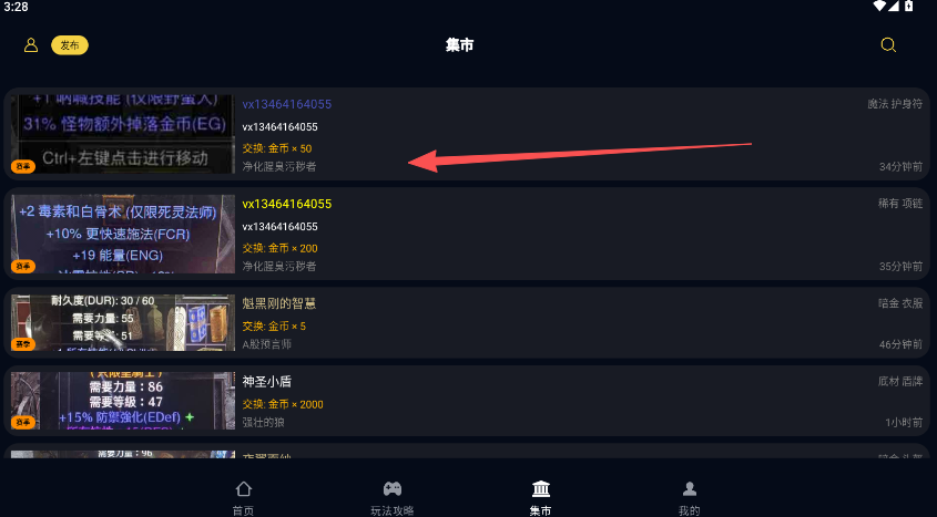 1、暗黑核集市交易,具体要在物品详情查看页完成,登录状态找到你要交易的物品分类。