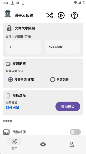 进行权限配置,选择“按需申请(推荐)”或“申请列表”方式;在模板选择处,可点击“选择模板”更换当前模板(如“打开网站”),还能开启传输配置里的功能(如“传输相册”)。