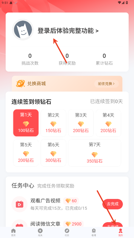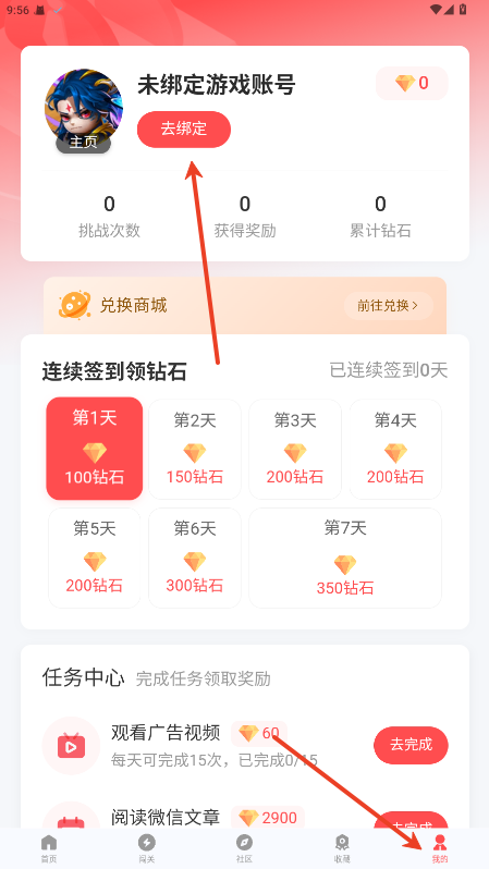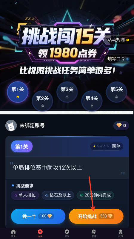 1.在闯关栏,绑定游戏账号后点击开始挑战