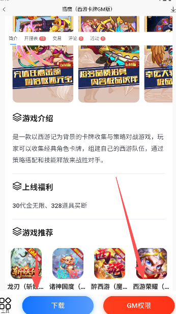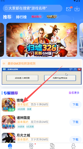 4、首页转服推荐可玩无限元宝的GM游戏版本。