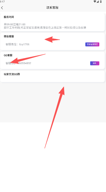 2、选择复制添加微信客服、QQ客服或是加入群聊联系客服。