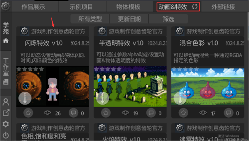 3、在学苑页面点击动画与特效,查看不同特效资源素材。