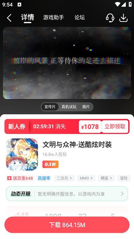 2、进入软件后找到感兴趣的游戏,点击领取648福利,下载。