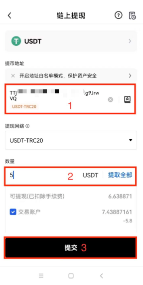 粘贴来自第三方平台的接收地址或者扫描该地址二维码,选择并核对【提现网络】,输入【数量】,点击【提交】。