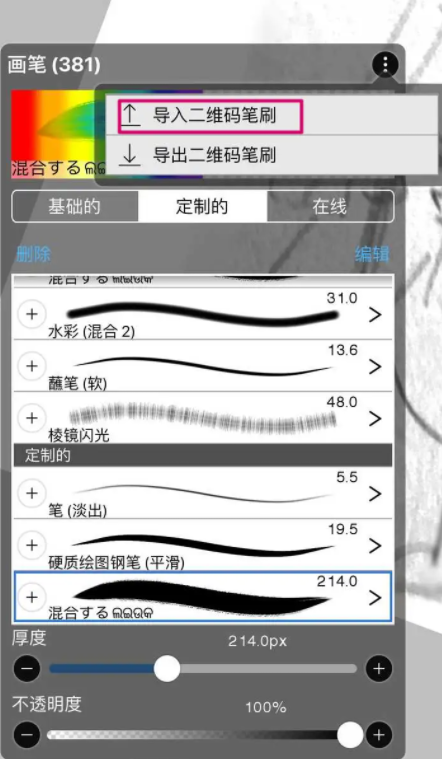 导入后,笔刷会出现在“我的笔刷”列表中,可拖动排序或重命名。