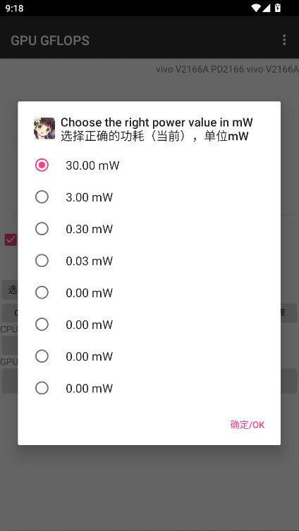 1、打开软件后会显示手机GPU的实际功率消耗值,用户选择一个GPU的功率值进行测试