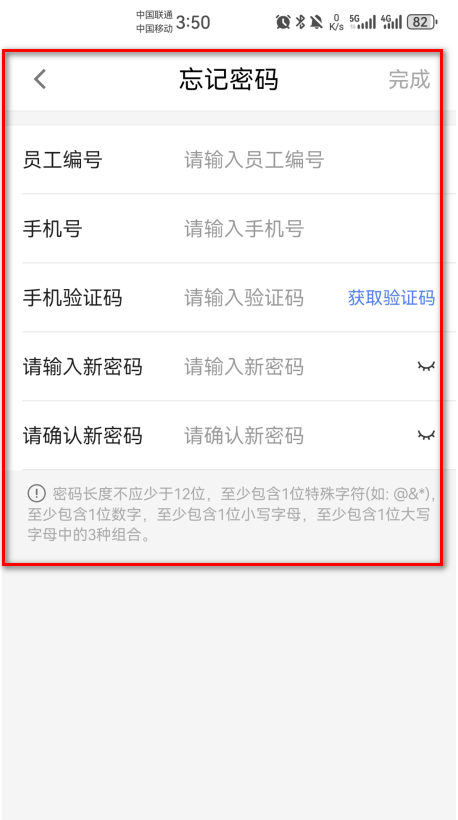 2.输入自己的员工编号、手机号、手机验证码、新密码、确认新密码,再点击完成即可。