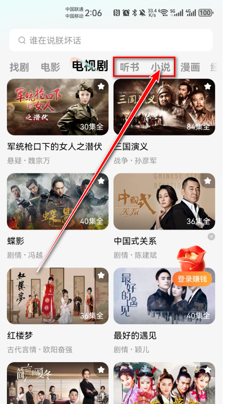 4.大家可以点击听书或者小说。在这里小编以点击小说为例。