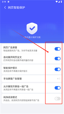 5、在网页智能保护页面开启网页广告屏蔽等功能
