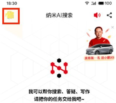 1.首先打开纳米AI搜索app,进入软件后点击界面左上角的头像选项。