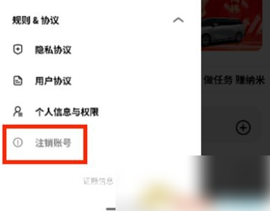 3.点击后会跳出更多的功能选项,找到其中的【注销账号】选项并点击。