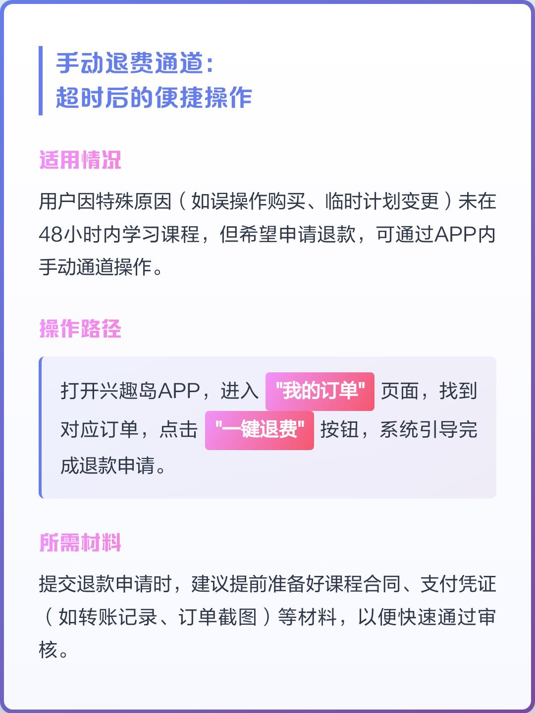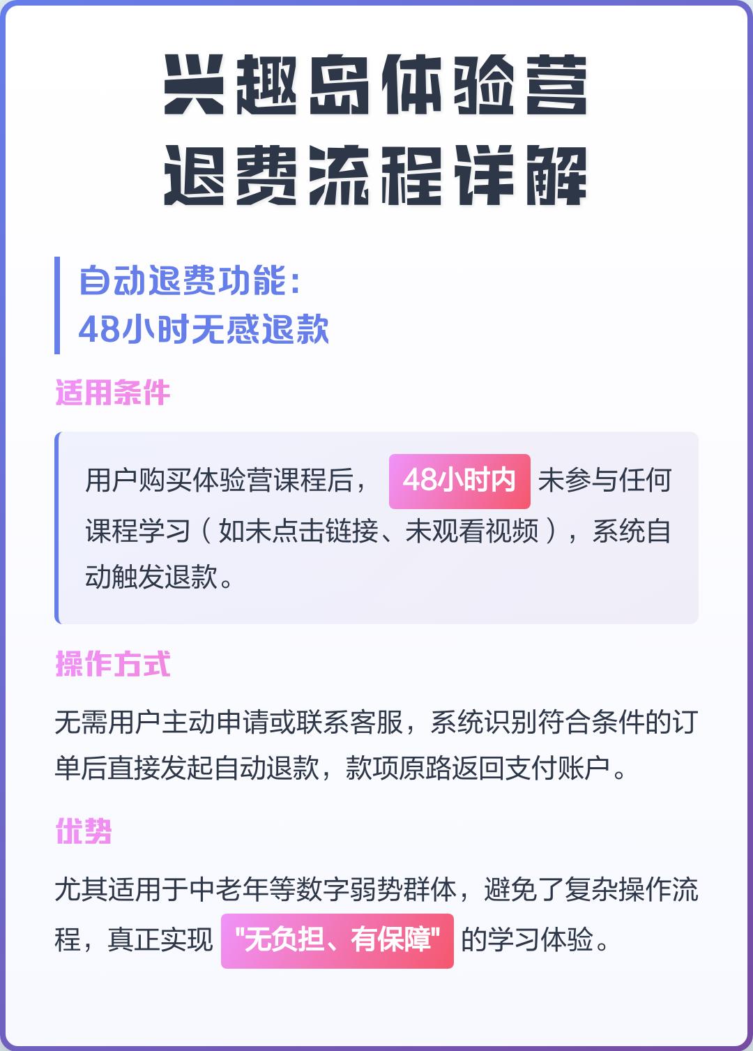 买了兴趣岛体验营课程后,48小时内没参与任何学习(比如没点课程链接、没看视频这些),系统会自动触发退款。