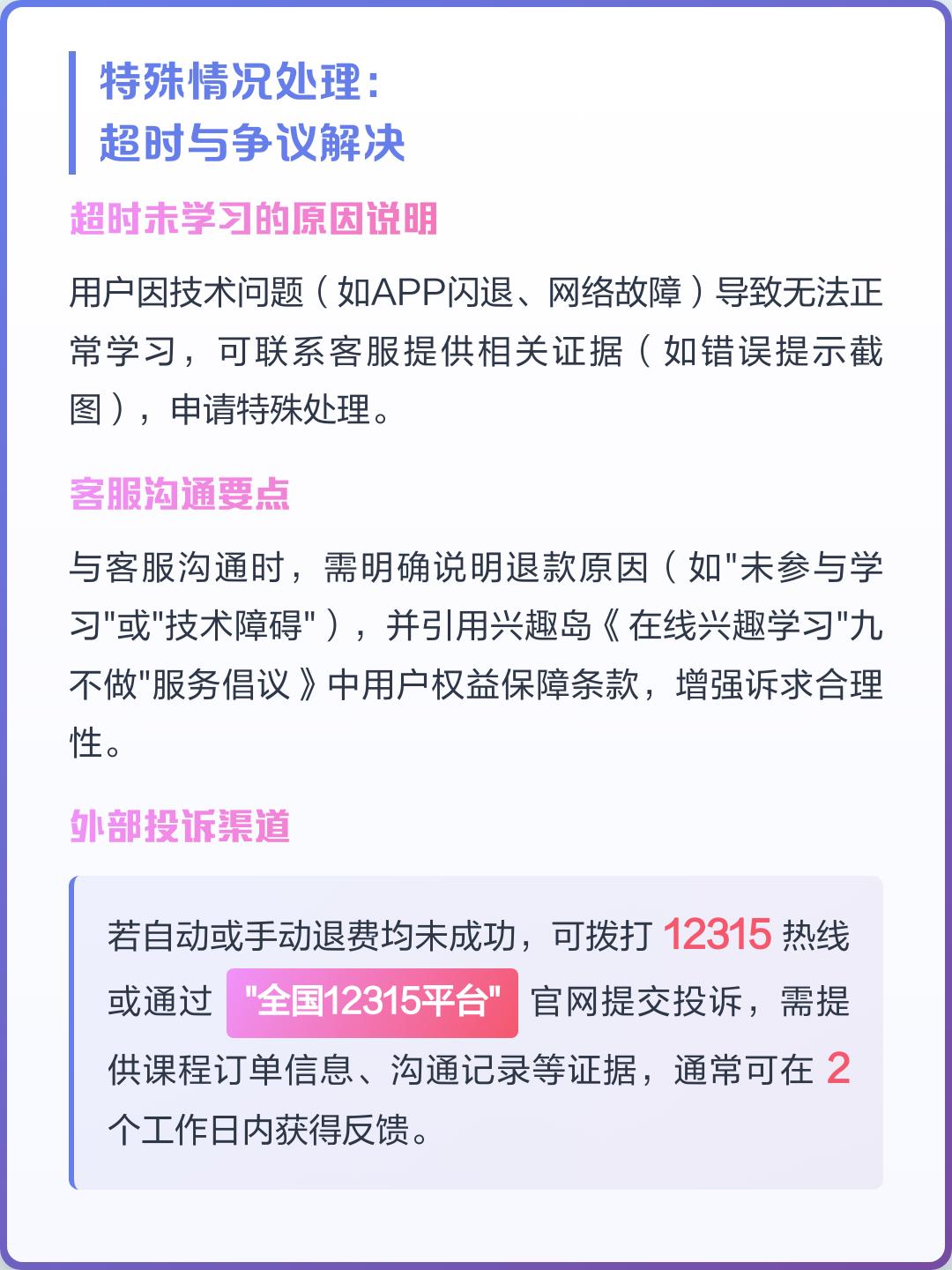 跟客服说明退款原因(比如“未参与学习”或者“技术障碍”),引用兴趣岛《在线兴趣学习“九不做”服务倡议》里的相关条款。
