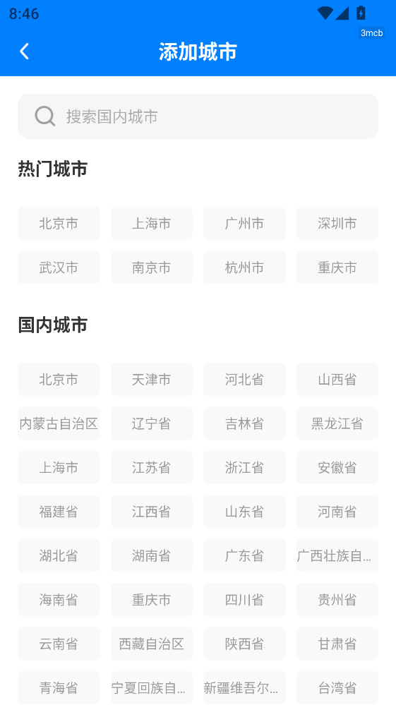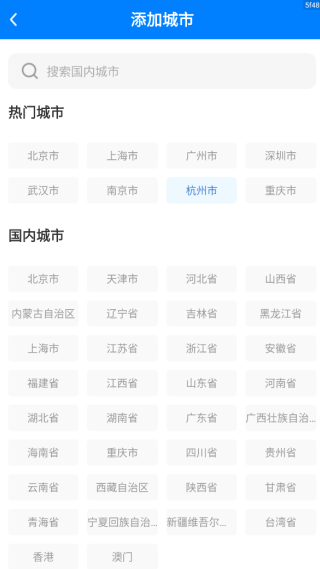 3.今日添加城市界面,可以直接搜索国内城市,也能直接在下方的城市中选择。