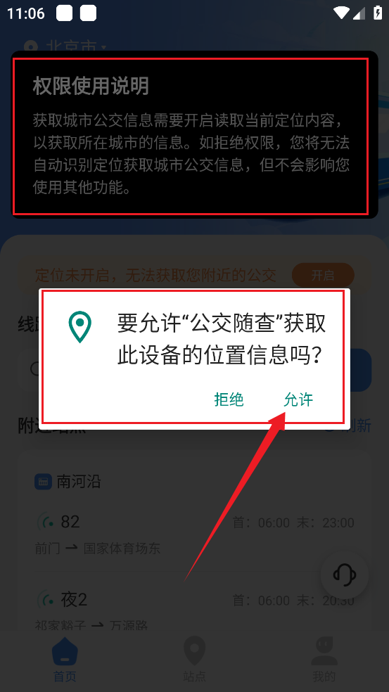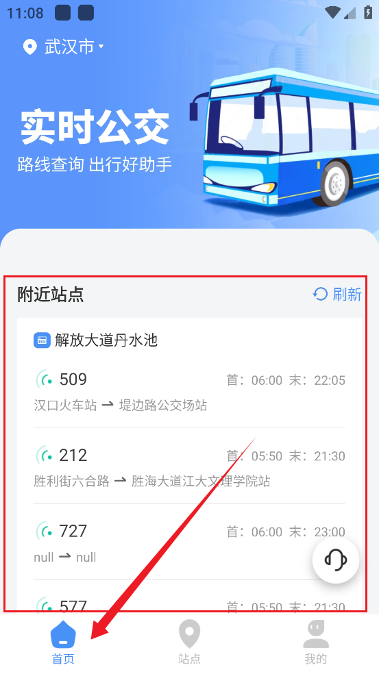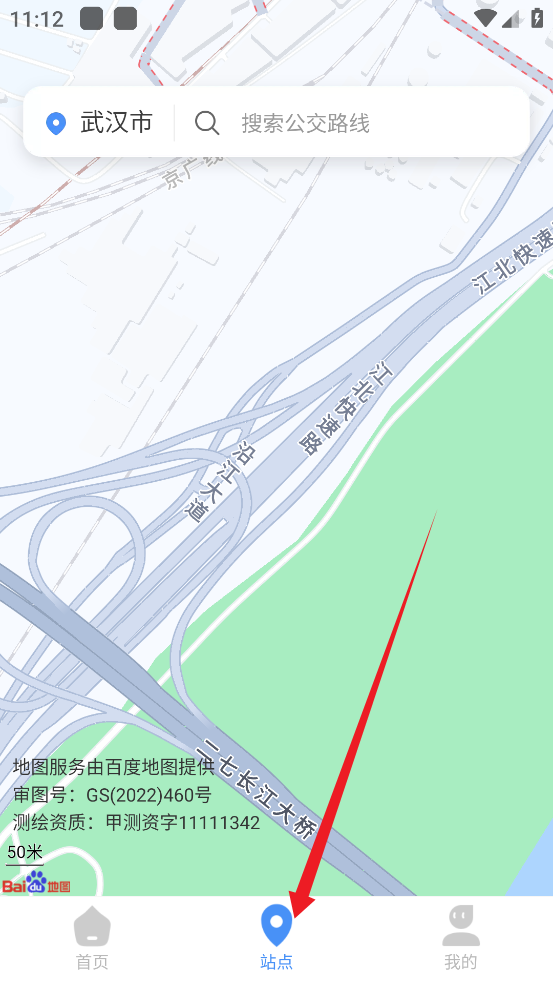 3、然后软件会定位到当前所在位置,并给出【附近站点】信息